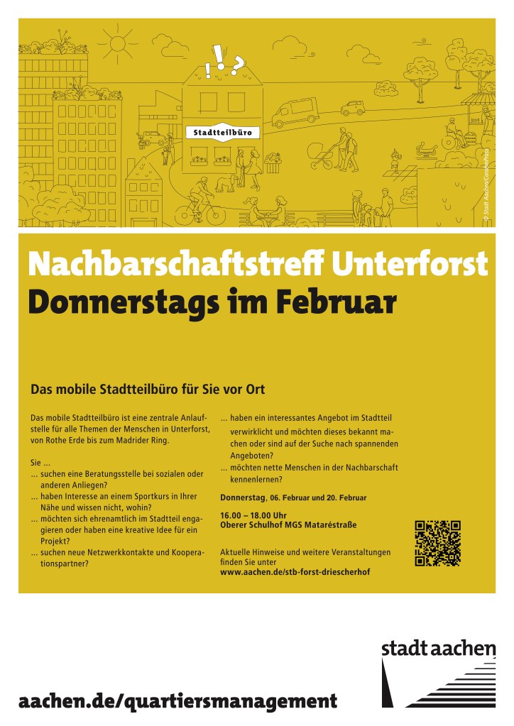 Kommenden Donnerstag, 6. Februar, und übernächsten Donnerstag, 20. Februar, wird das mobile Stadtteilbüro von jeweils 16 bis 18 Uhr am oberen Schulhof der MGS Mataréstraße (in der Zeppelinstraße) zu finden sein.