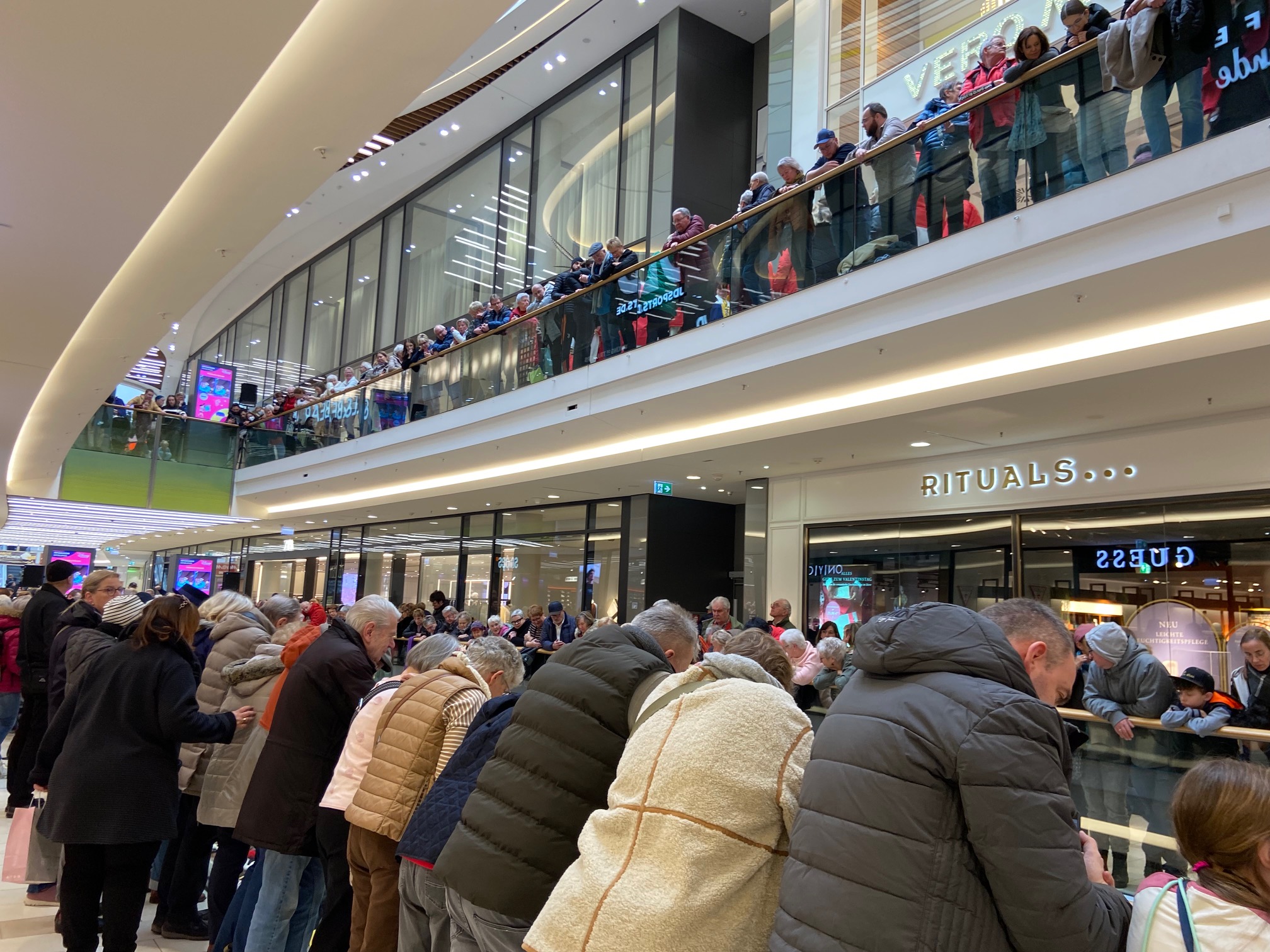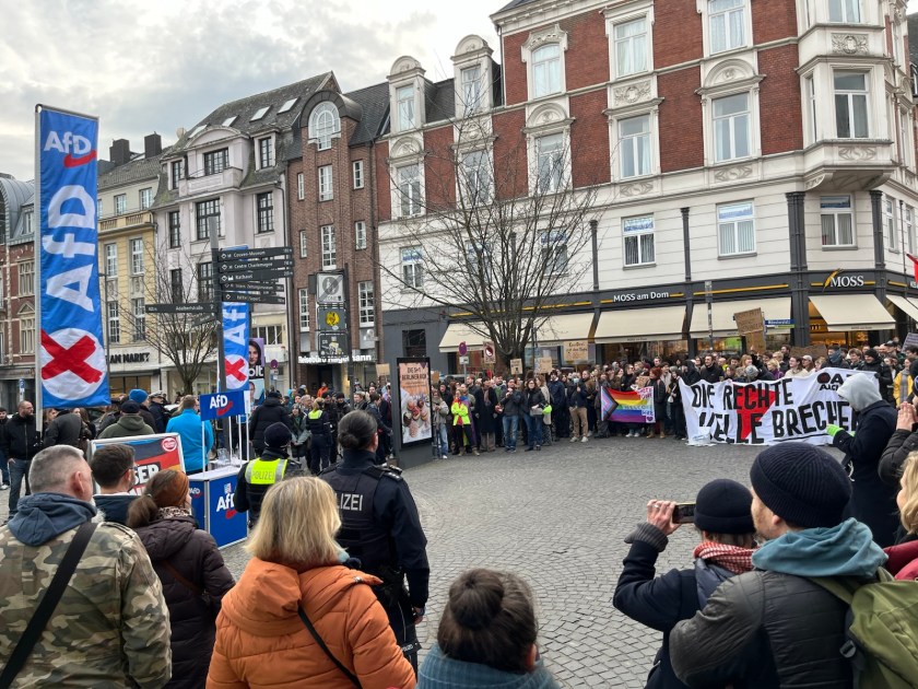 AfD, Gegendemonstranten, Polizisten und ein Musikcorps standen sich kurzfristig am Geldbrunnen unmittelbar gegenüber. Foto: Henning BrinkmannFasziniert von den Musikcorps und den Karnevalisten in ihren Uniformen: Menschen im Aquis Plaza. In verschiedenen Kneipen stand nur eins im Mittelpunkt: das Spiel der Alemannia gegen Erzgebirge/Aue.