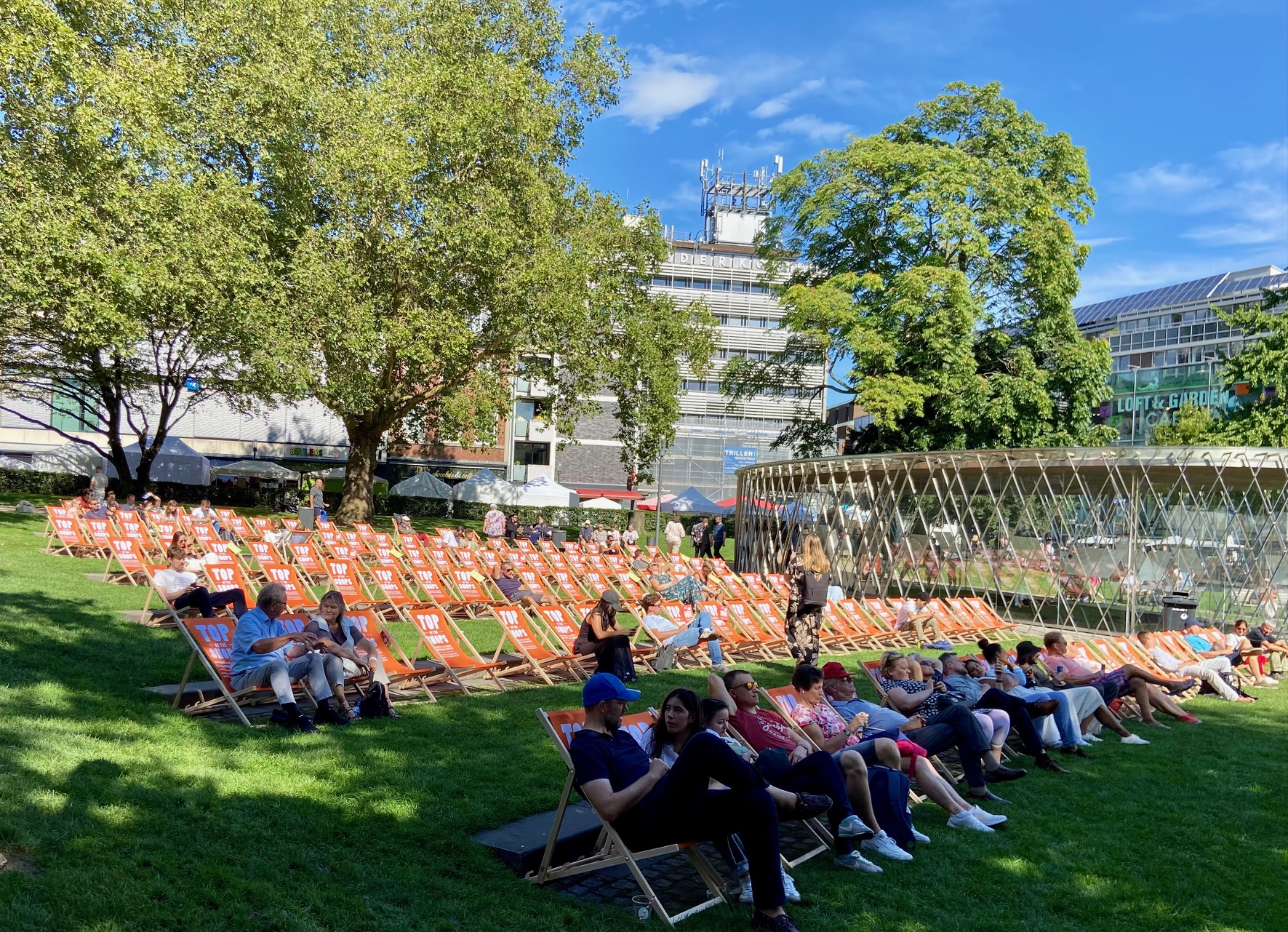 Samstag war wieder Liegestuhlaktion im Elisengarten. Ab 11 Uhr standen 100 orangene Liegestühle im Elisengarten bereit. Schnell war im Schatten kein Platz mehr frei. (hör den Podcast. Wenn Hitze uns krank macht.)