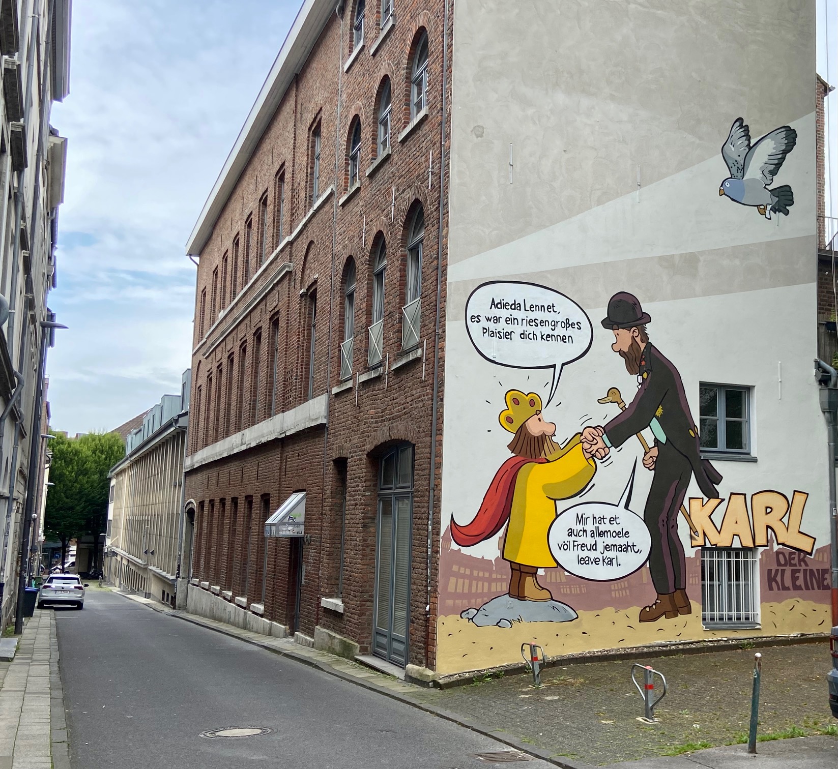 Südstraße? Wir wissen es nicht. Aber schön aussehen tut es sehr. In der Horngasse gesehen. Karl ist dort kleiner als Lennet Kann und hat auch etwas wenig Text. Die beiden treffen sich auf dem Marktplatz. Rechts oben kommt noch der Heilige Geist herbeigeflogen. Was der da zu suchen hat? Keine Ahnung.