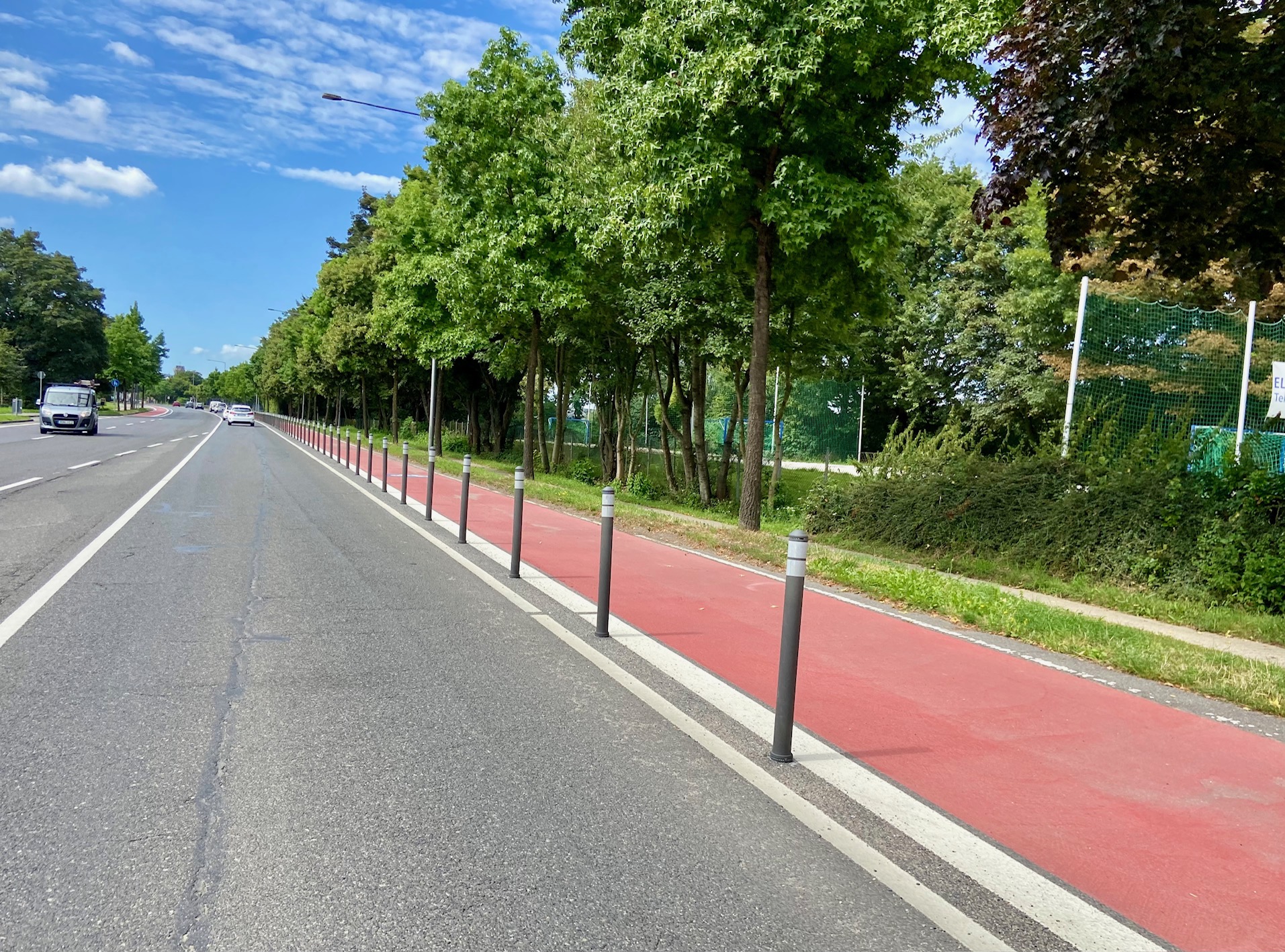 Heute quasi zufällig drauf gefahren! Ein Traum! Neben der breiten Fahrbahn für Pkw gibt es eine Fahrbahn für Räder, und daneben ist Platz für Fußgänger*innen. In Holland vielleicht nichts Besonderes, in Aachen purer Luxus. Und: Die Stäbe sind dehnbar, nicht starr. Da freut man sich, dass sowas in Aachen denn doch möglich ist.