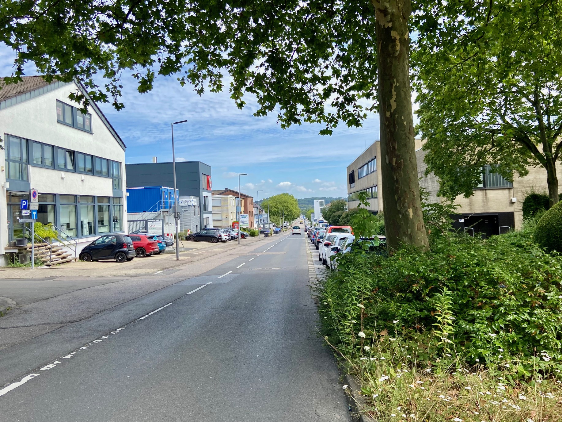 Eine Straße, die Chancen auf den Titel „kaputteste Straße von Aachen“ hat, das ist der Grüne Weg. Rechts und links von der Schlaglochpiste gibt es viele Firmen und Handwerksbetriebe. Wir befinden uns in einem Gewerbegebiet. Auch dort soll es neue Radwege geben.
