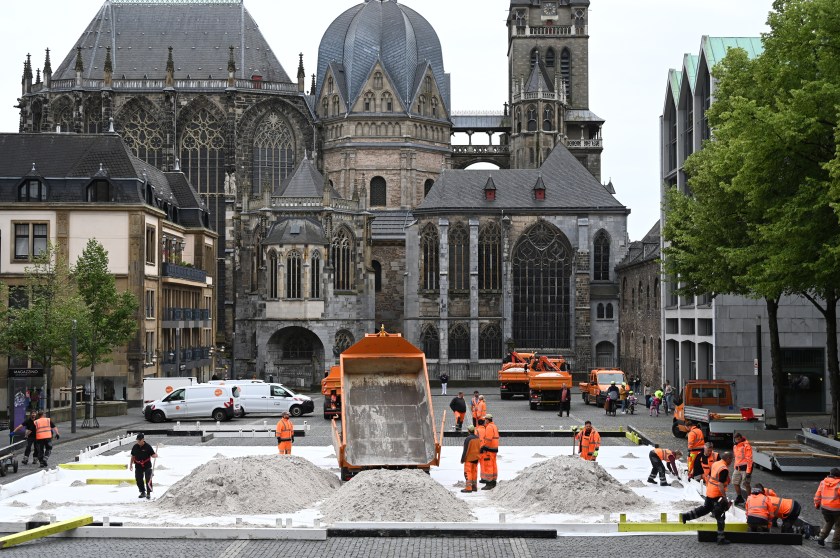 Pünktlich zum Start der Sommerferien rollten am Freitag um 7 Uhr die ersten Fahrzeuge des Stadtbetriebs auf den Katschhof – beladen mit Balken, Werkzeug und vor allem: Sand. Der Archimedische Sandkasten wird routiniert vom Team des Aachener Stadtbetriebs aufgebaut.