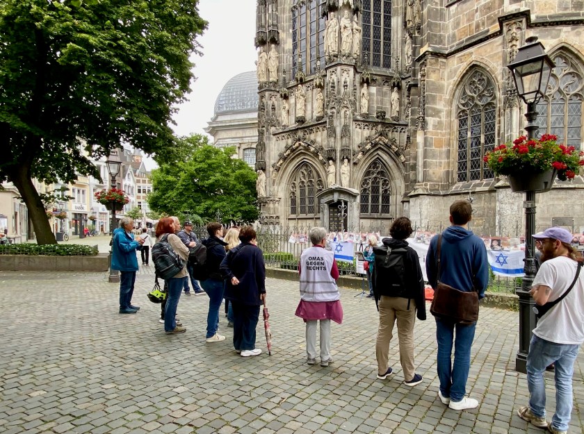 Es sind nicht sehr viele Personen, die kurz an die von der Hamas entführten über 100 Geiseln erinnern und ein Zeichen gegen Antisemitismus setzen. Bei jeder Mahnwache kommt es bedauerlicherweise zu Anfeindungen: Vorbeigehende rufen Schmähungen und verschwinden dann ganz schnell. Man kann davon ausgehen, dass es Hass auf Juden auch in Aachen gibt. So ist es bei den Mahnwachen erforderlich, dass die Polizei anwesend ist, insbesondere nachdem es Anfang Juni zu einem Übergriff kam, als eine Israel-Flagge weggerissen und dann zertrampelt wurde.