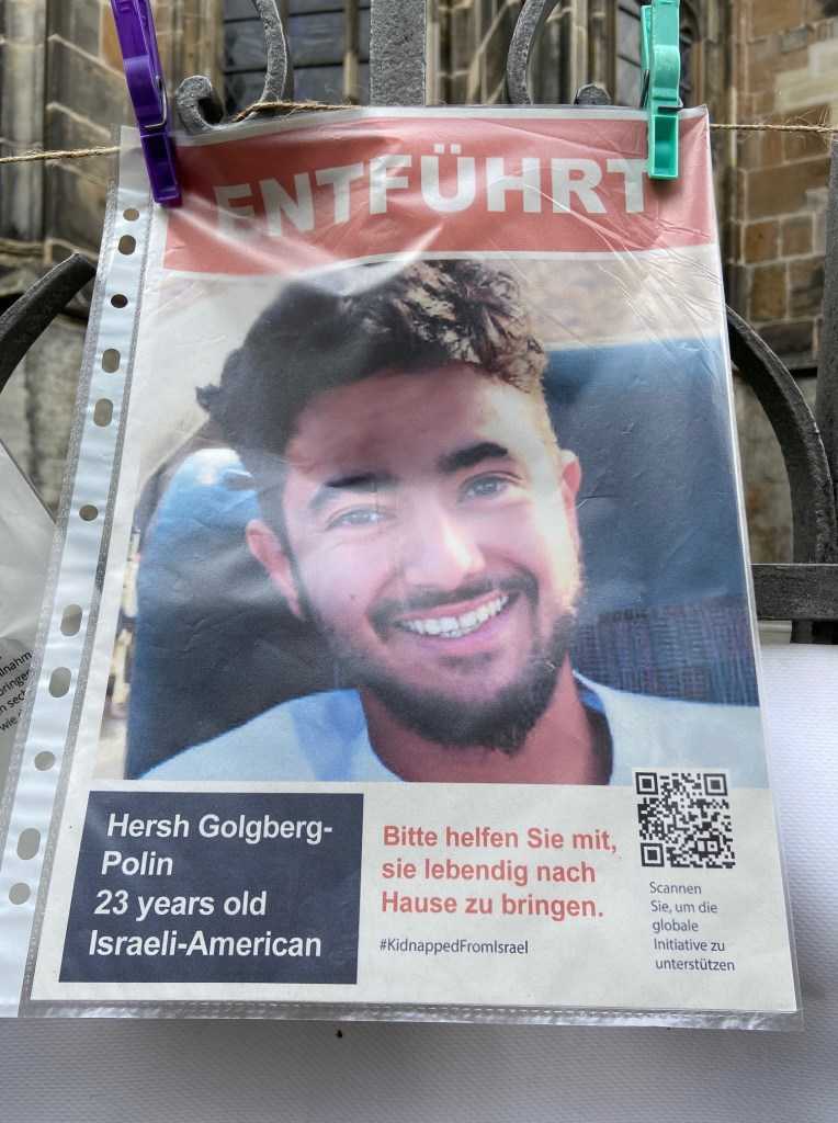 Vergangenen Freitag erinnerte die hiesige Vorsitzende der Deutsch-Israelischen Gesellschaft (DIG), Elisabeth Paul, an Hersh Goldberg-Polin (24), der bei dem Anschlag der Hamas (am 7. Oktober 2023) durch besonders mutiges Reagieren bekannt geworden ist. Auch Felix Kehren, Sprecher des Jungen Forums in der DIG, mahnte, und er erinnerte an Juden-feindliche Vorfälle in 2 Schulen. Außerdem wurden die Namen aller Geiseln vorgelesen, damit die Menschen und ihr grausames Schicksal in der Öffentlichkeit nicht in Vergessenheit geraten.