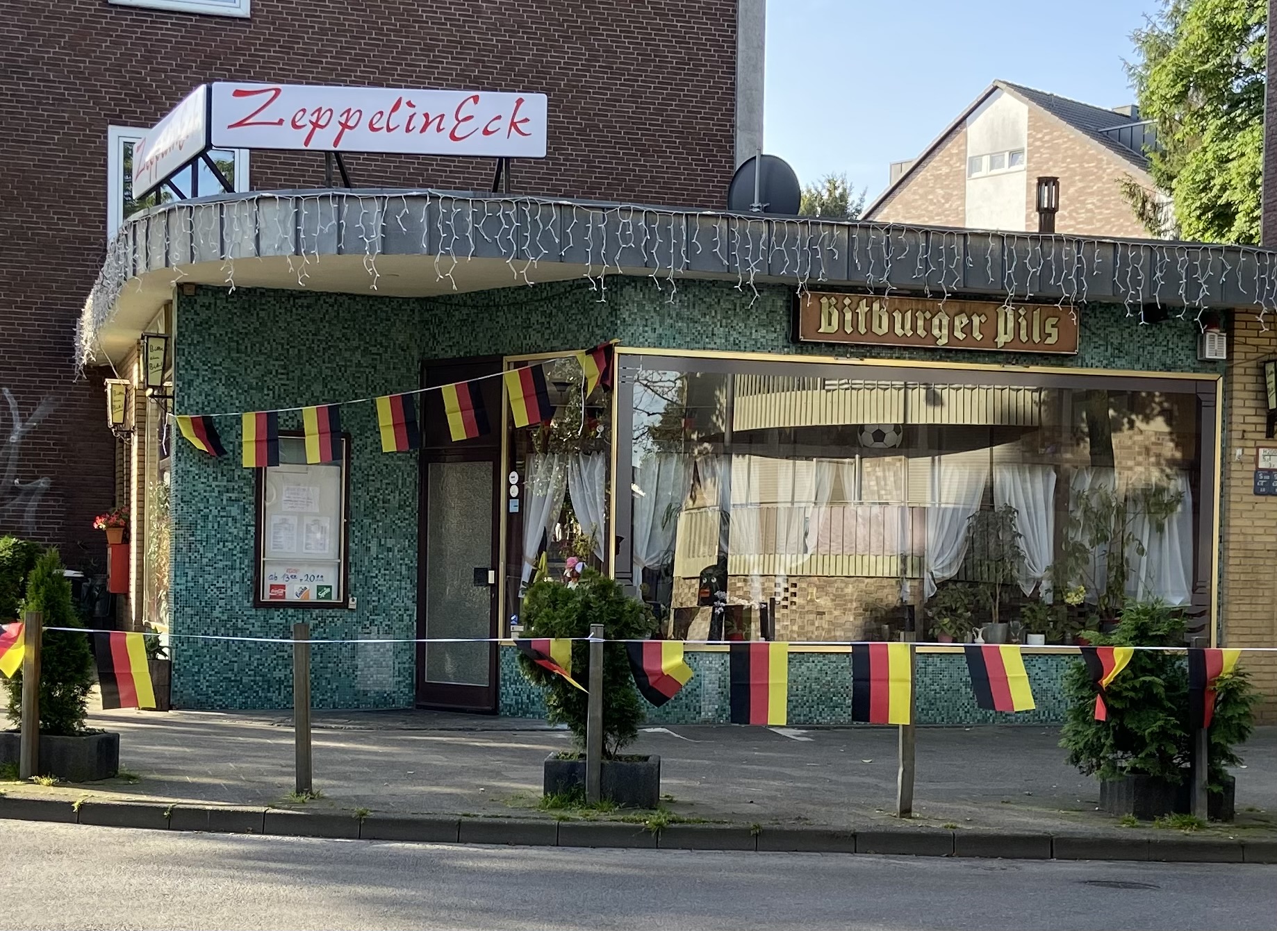 Man stelle sich vor, die Mannschaft kommt heute weiter und wird Europameister – die Zeppelinstraße wird man nicht mehr wiedererkennen. Links im Bild sieht man übrigens noch ein SPD-Wahlplakat; aber die Partei der Studienräte und Rechtsanwälte bekommt in dem Viertel kein Bein mehr auf die Erde. Aus bekannten Gründen. Da können sie die Wahlplakate noch Monate hängen lassen.