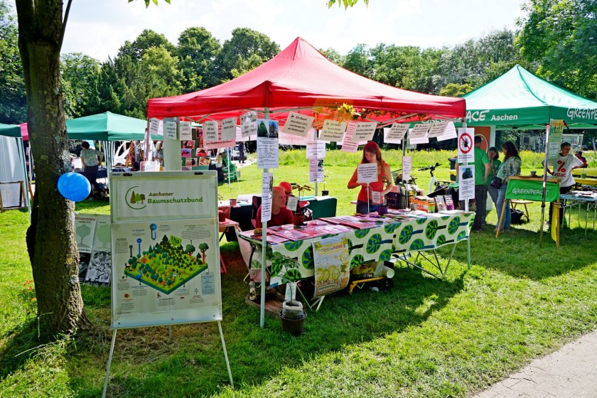 Auf dem Gelände waren über 100 Stände aufgebaut – mit dabei die Aachener Baumschützer. Der Tag war gut organisiert und das Wetter angenehm. Allerdings haperte es etwas an „Laufkundschaft“, was wohl auf die (für diesen Zweck) etwas abgelegenen Örtlichkeit zurückzuführen ist.
