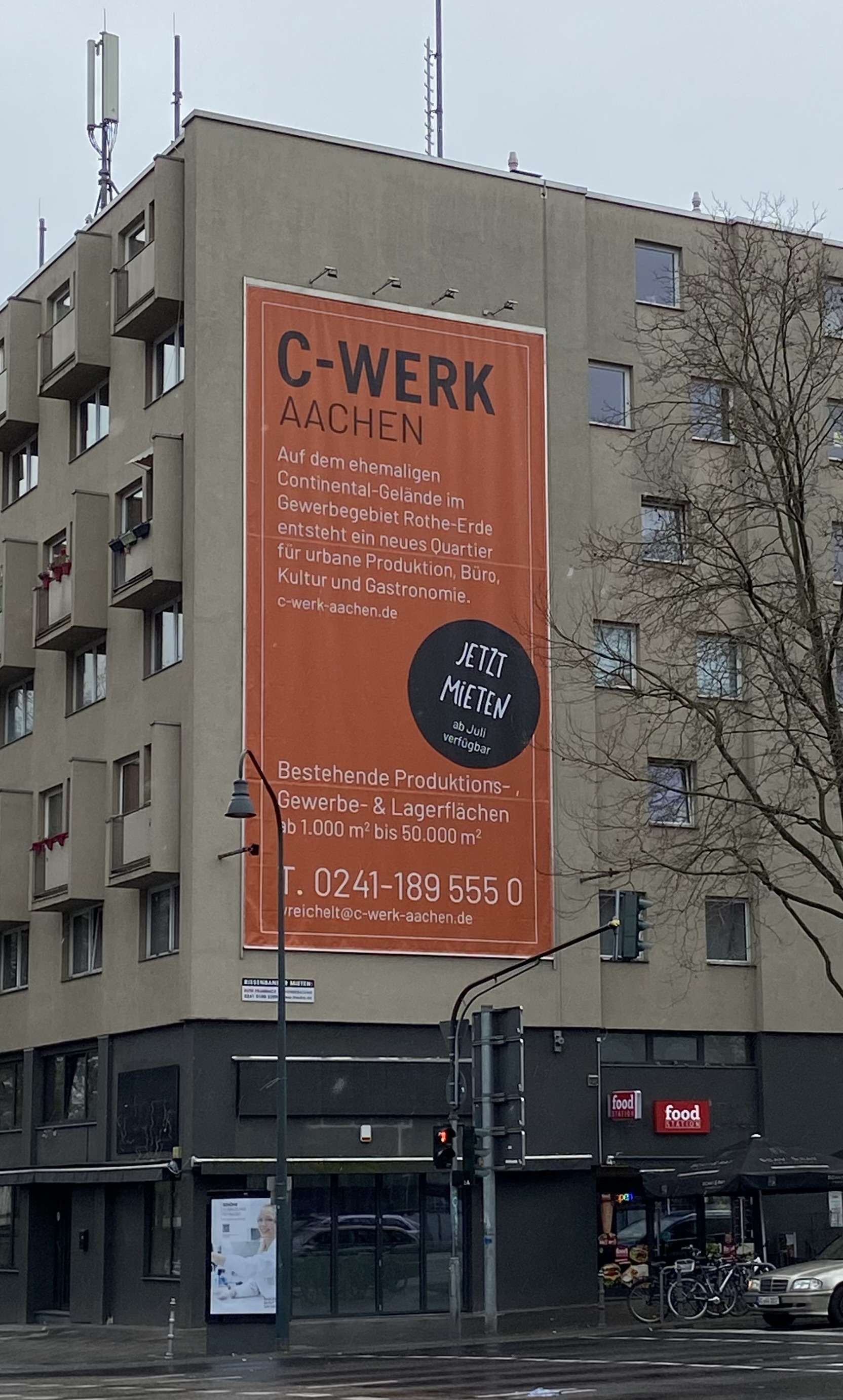 Wir warten ab und werden berichten über das, was an urbaner Produktion Büro, Kultur und Gastronomie (s. Riesentransparent) sich in Rothe Erde entwickeln wird. Bleibt dran.