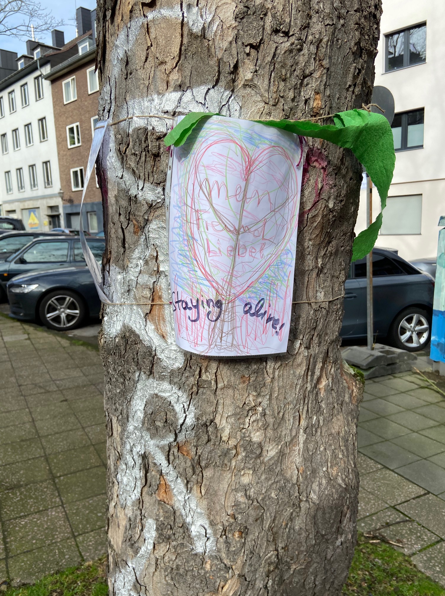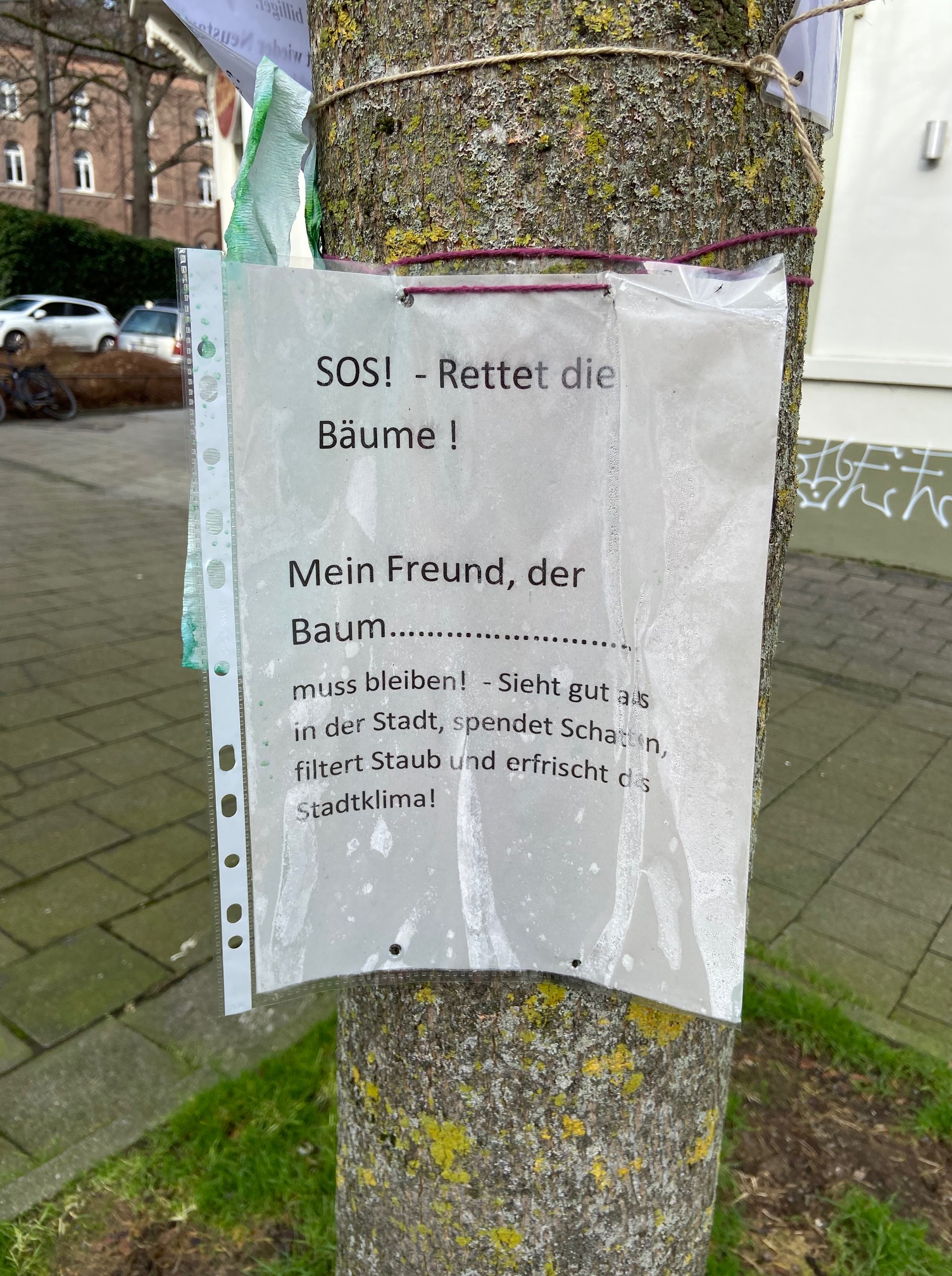 Stehen fest und sehen eigentlich gar nicht krank aus: die Bäume auf dem Lothringerstraßen-Platz. Verschiedene Anwohner*innen und wohl auch Kinder haben versucht klarzumachen, wie wichtig ihnen die Bäume sind.