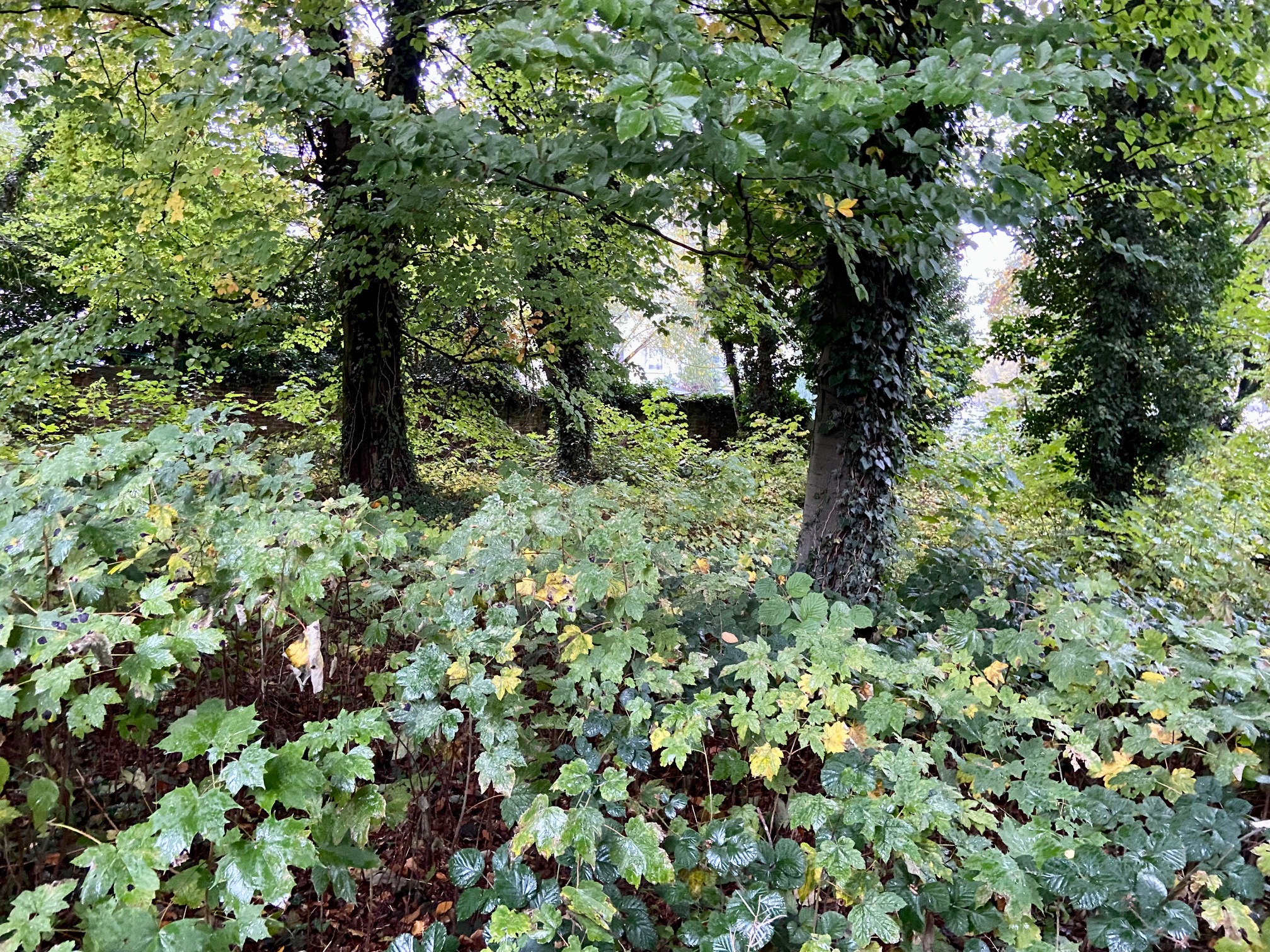 Der Garten von St. Bonifatius in der Mataréstraße ist ein kleiner Park mit viel Wildwuchs. Die Kirche wird bald profaniert (d.h. entweiht), hoffentlich wird der Garten verschont. Er wäre ein idealer Spielgrund für die Kinder aus der Montessori Grundschule von gegenüber. Das Viertel hat in den letzten fünf Jahren viel Grünfläche verloren. Hoffentlich muss nicht auch noch der verwilderte Garten dran glauben. Das Kirchenschiff von St. Bonifatius, es steht unter Denkmalschutz. Es ist ein moderner Bau und gleicht einer Fabrikhalle, die allerdings durch Fenster von Glaskünstlerin Maria Katzgrau erhellt wird. Die Kirche kann man beheizen, im Viertel hoffen die Menschen, dass sie das Gebäude einmal werden nutzen können.