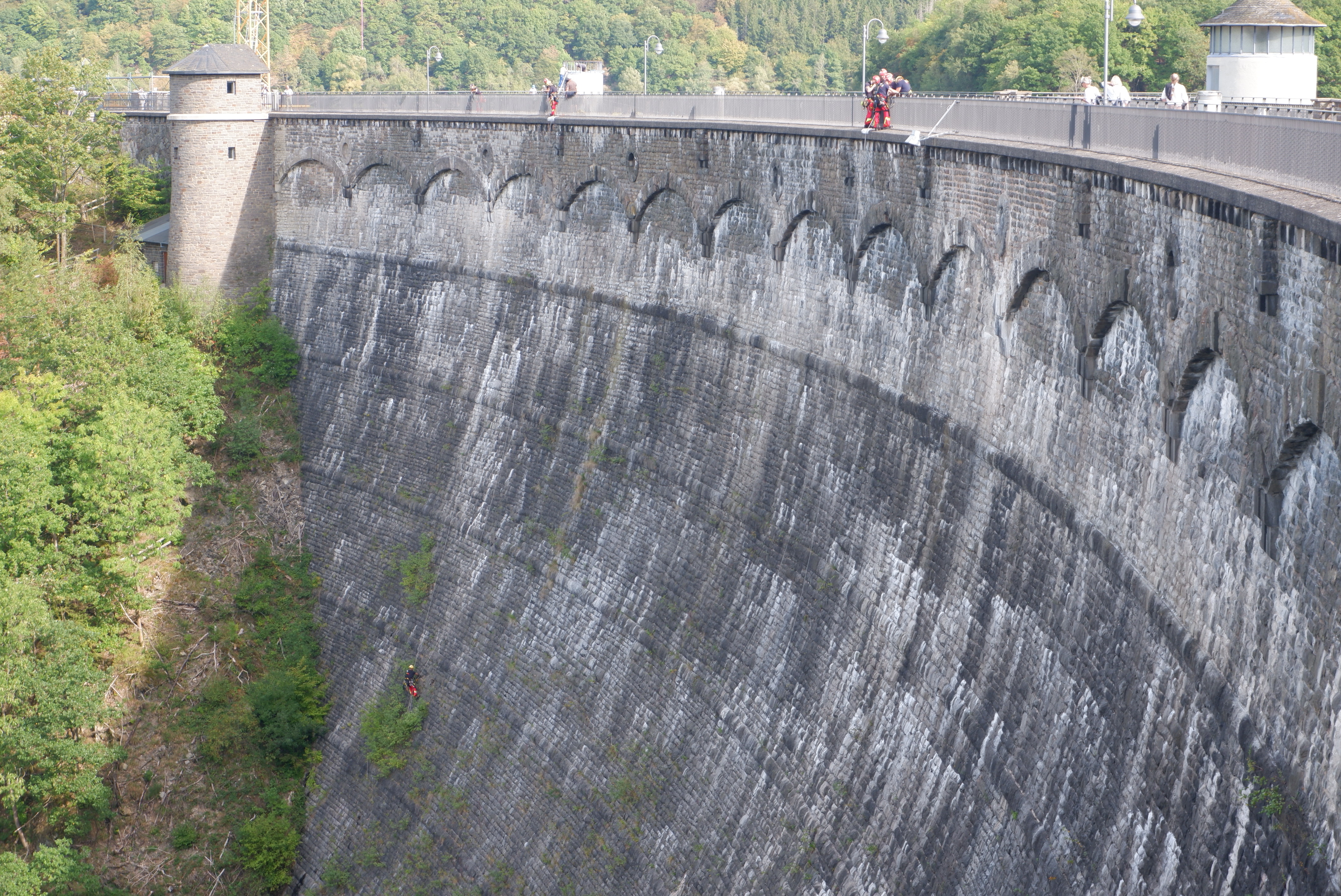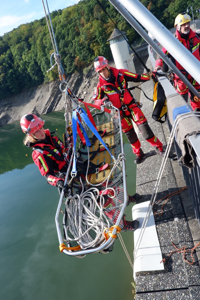 Job mit Tiefblick: An der rund 60 Meter hohen Urftalsperre übt die Spezialrettungsgruppe der Berufsfeuerwehr Aachen regelmäßig. Foto: Stadt Aachen/Stefan Herrmann