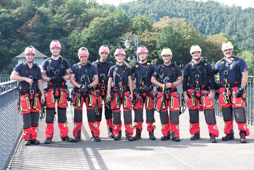 Dafür und damit alle Abläufe reibungslos funktionieren, müssen die Spezialretter ein intensives Trainingspensum absolvieren. 72 Stunden pro Jahr wird geübt – auf bis zu 150 Meter hohen Windrädern, auf Aachener Hochhäusern wie den Studierendentürmen und dem Drehturm Belvedere am Lousberg – oder eben an der imposanten Staumauer in der Eifel. Trotz des ernsten Trainingshintergrunds darf dennoch auch bei den Höhenrettern zwischendurch einmal der Blick in die Ferne schweifen. „Klar, das gehört dazu. Auch wir genießen kurz die Aussicht bei solch einer tollen Szenerie wie hier an der Urfttalsperre“, sagt Beek. Aber eben nur kurz, dann richtet sich der Fokus wieder auf die schweißtreibende Übungsarbeit.