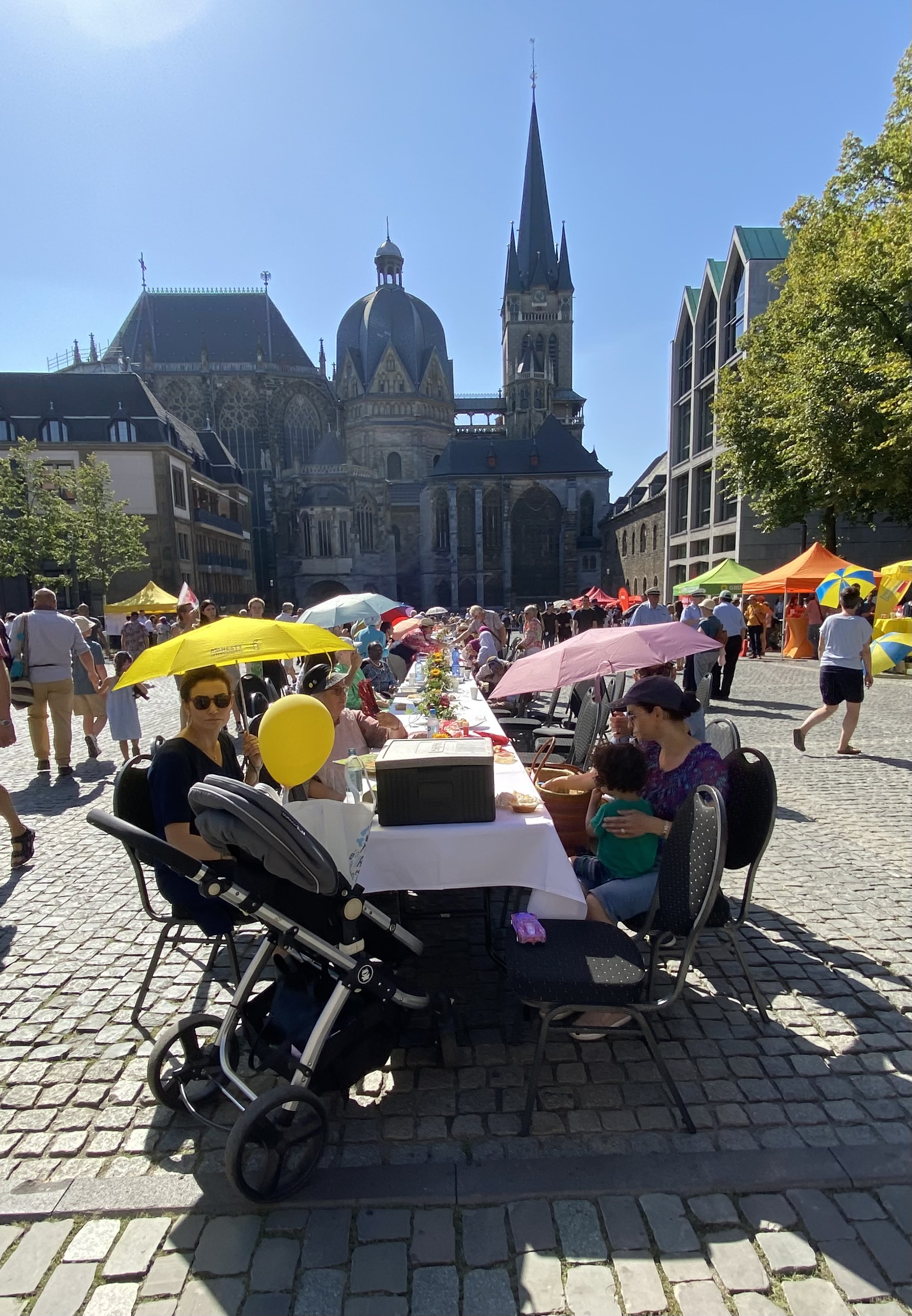 Schon am Vormittag (ab 10 Uhr) hatte es im Krönungssaal des Rathaus eine Feier gegeben – anlässlich der Einbürgerung von über 400 Personen, die Deutsche geworden sind. Nach dieser Feier traf man sich auf dem Katschhof zu einem Picknick an einer langen Tafel. Bands sorgten für prima Unterhaltung.