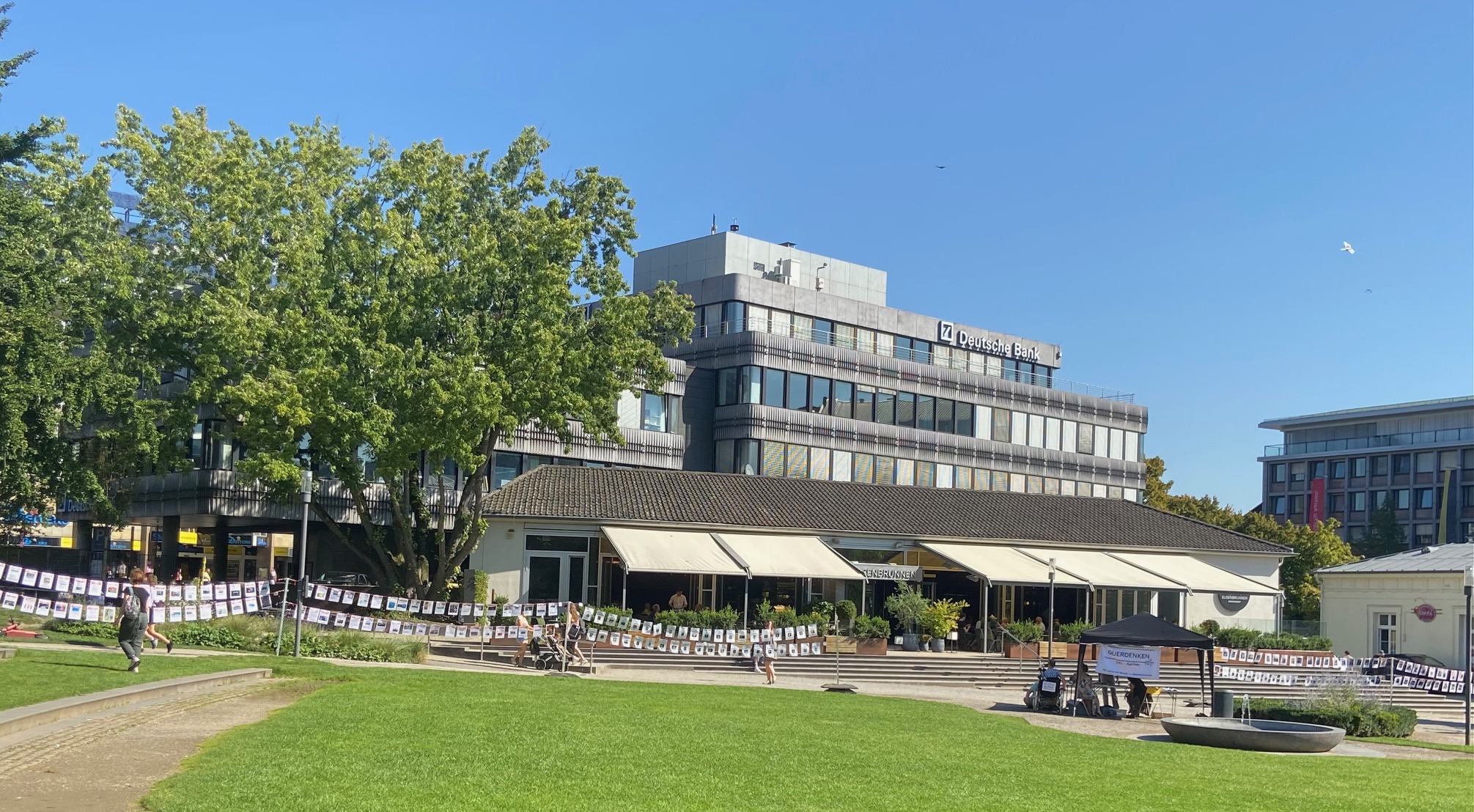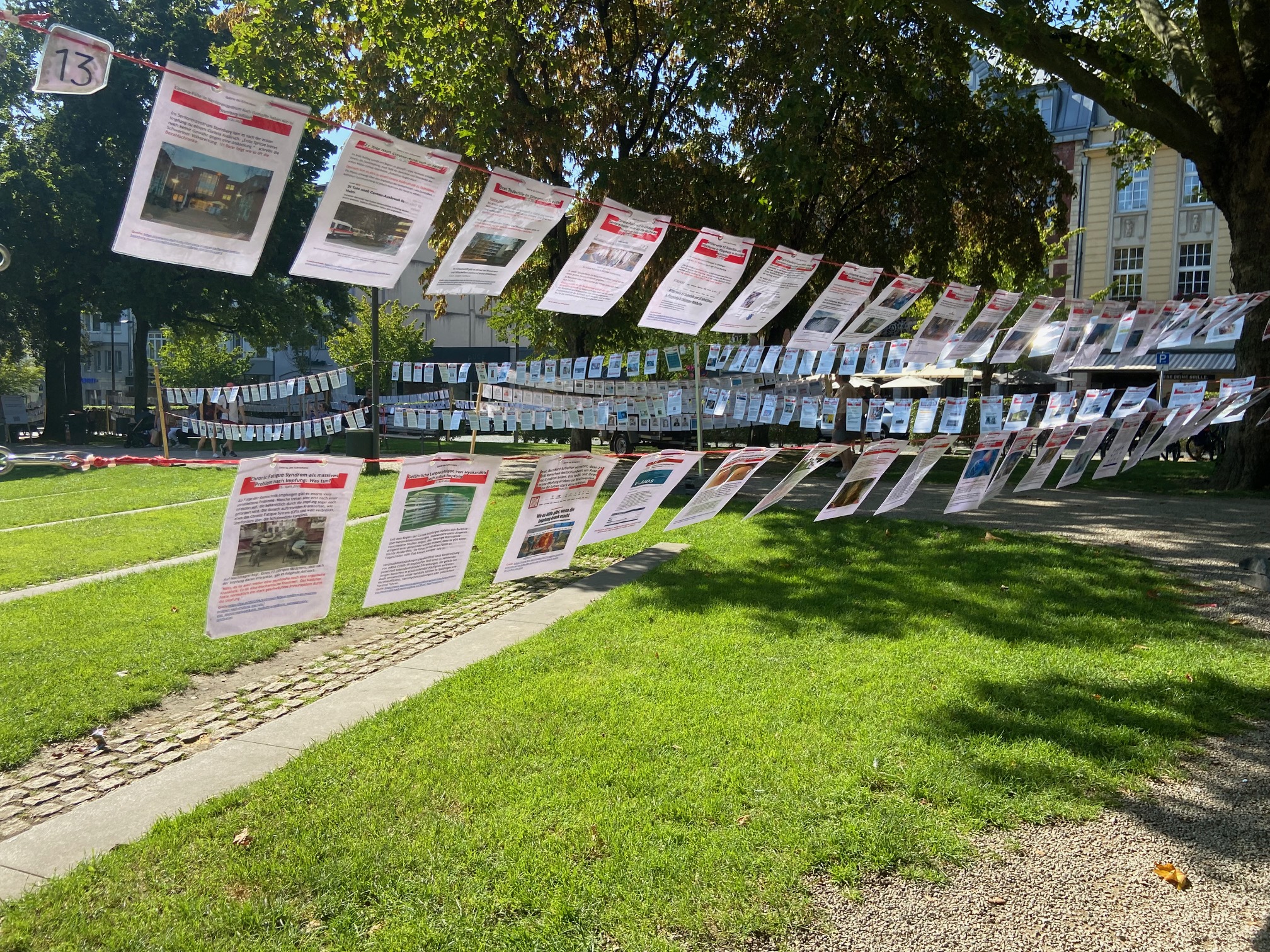 War nicht zu übersehen: ein Installation im Elisengarten mit Texten und Fotos aus aller Welt, die die Gefährlichkeit von Masken und Impfungen bezeugten.Masken und Impfungen habe es gegeben, um angeblich die Bevölkerung einer Art Gehirnwäsche zu unterziehen. Die gigantische Zahl der nach den Impfungen Verstorbenen und Erkrankten werde angeblich verheimlicht.