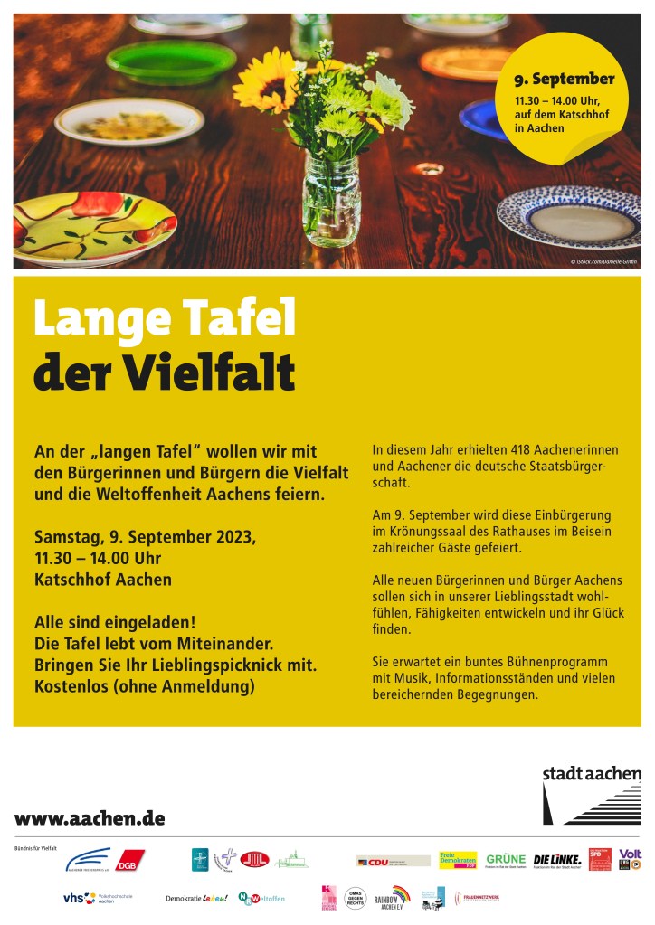 „Im vergangenen Jahr erhielten 418 Menschen aus den unterschiedlichsten Nationalitäten in Aachen die deutsche Staatsbürgerschaft.“ Diese frohe Kunde verbreitete neulich die Pressestelle der Stadtverwaltung. 418 Neubürger und Neubürgerinnen – das muss gefeiert werden, und zwar am Samstag, 9. September. Zuerst im Rathaus mit vielen Reden und dann auf dem Katschhof mit einer „Langen Tafel der Vielfalt“.