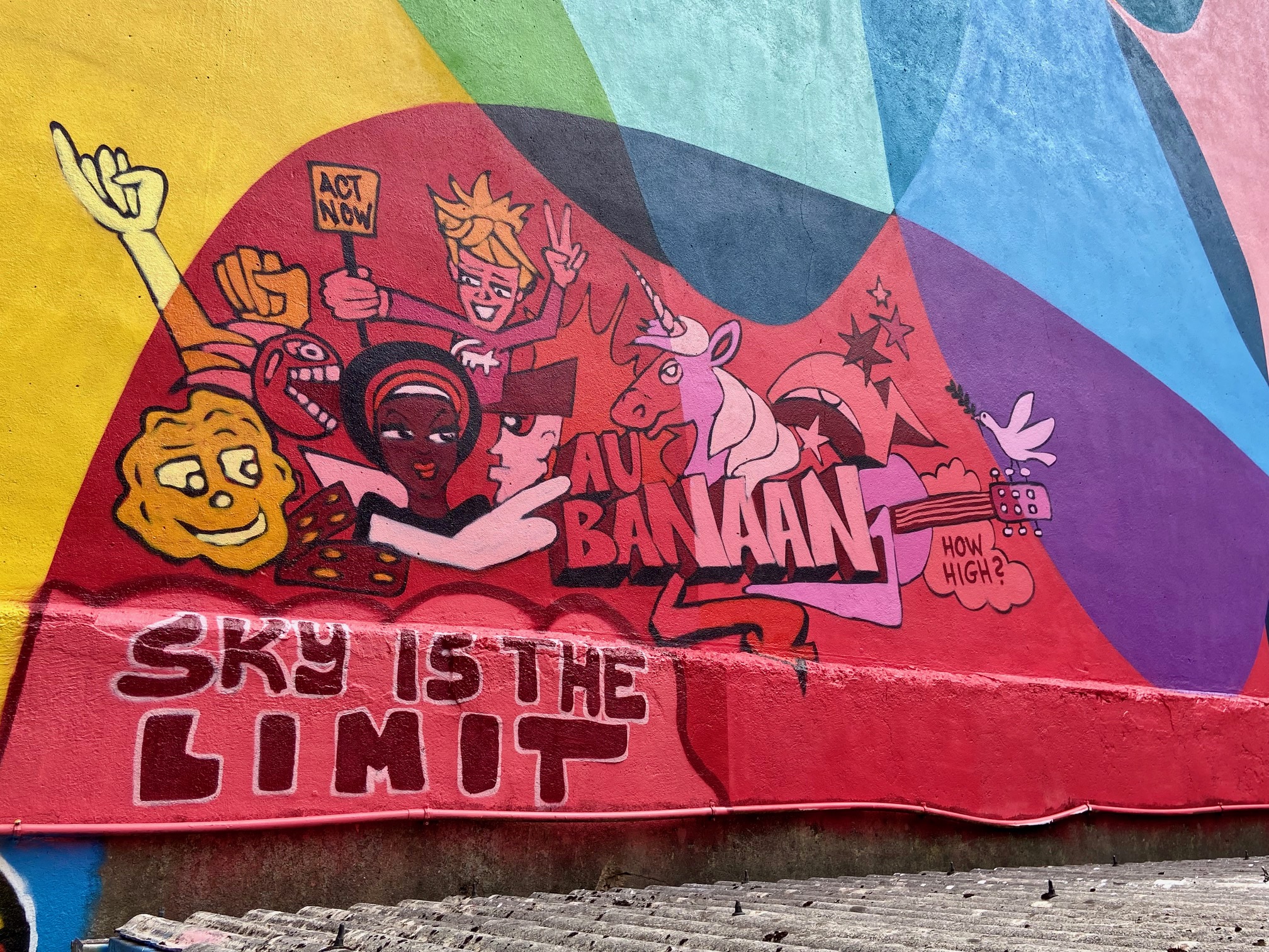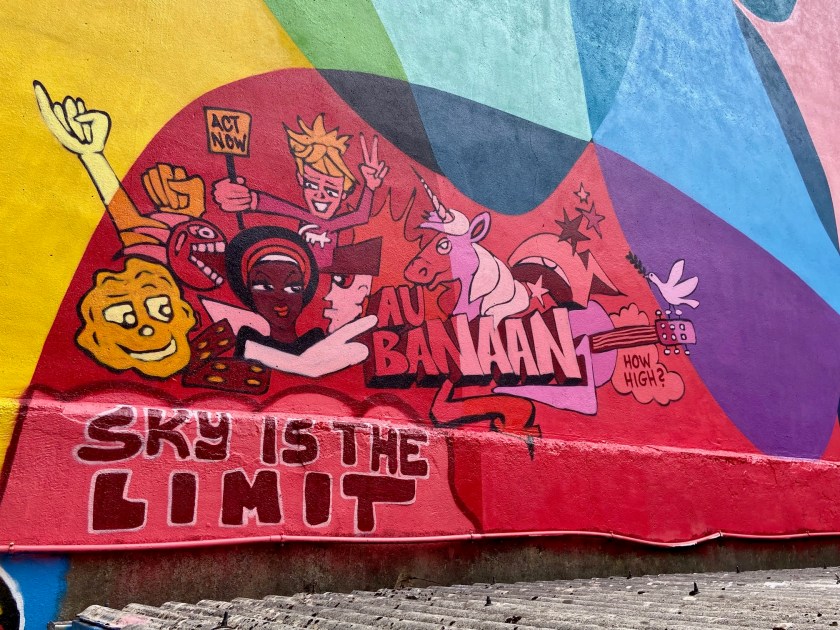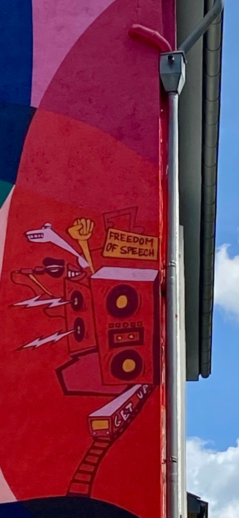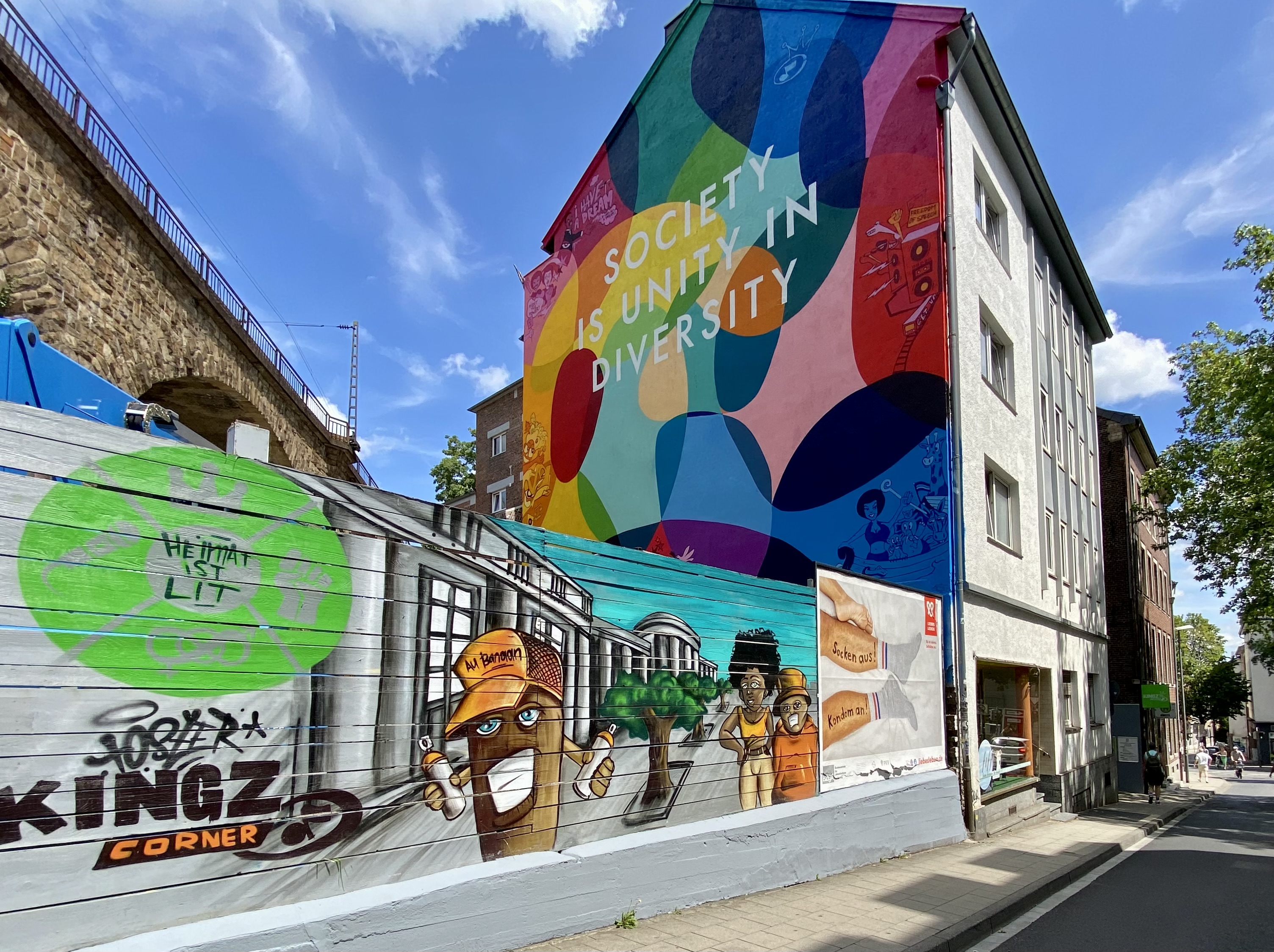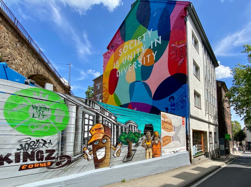 In der Königstraße in Aachen am Kingzcorner: „Society is unity in diversity“steht da.Die Straße war lange Zeit eine einzige Baustelle. Jetzt ist – einschließlich des monumentalen Wandbilds – alles fertig. Am Rand des Mauerbildes sind Szenen zu sehen, die man sich näher betrachten sollte. Es lohnt sich.