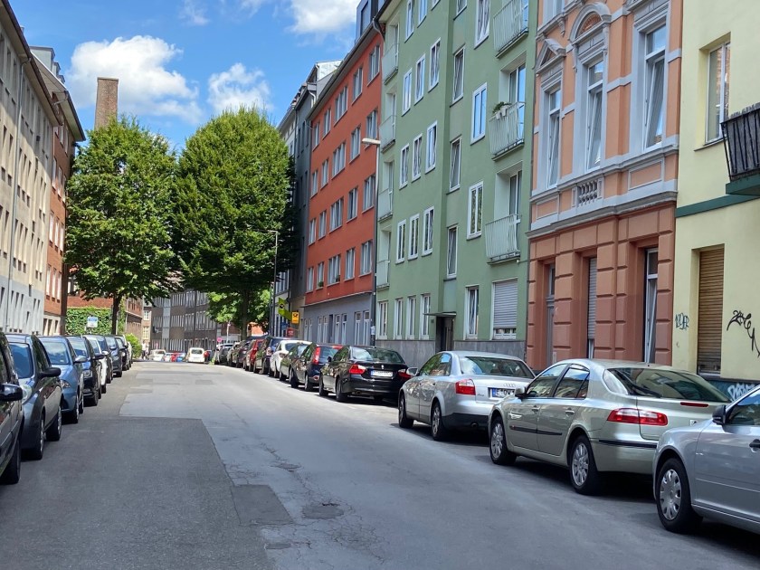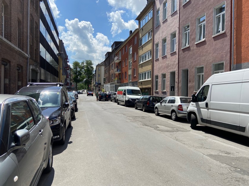 Die Krakaustraße (mit Blick in Richtung Mörgensstraße). Zur Orientierung: Hinten rechts (nicht im Bild) befindet sich die beliebte Gaststätte „Last Exit“ mit ihrer großen Terrasse.