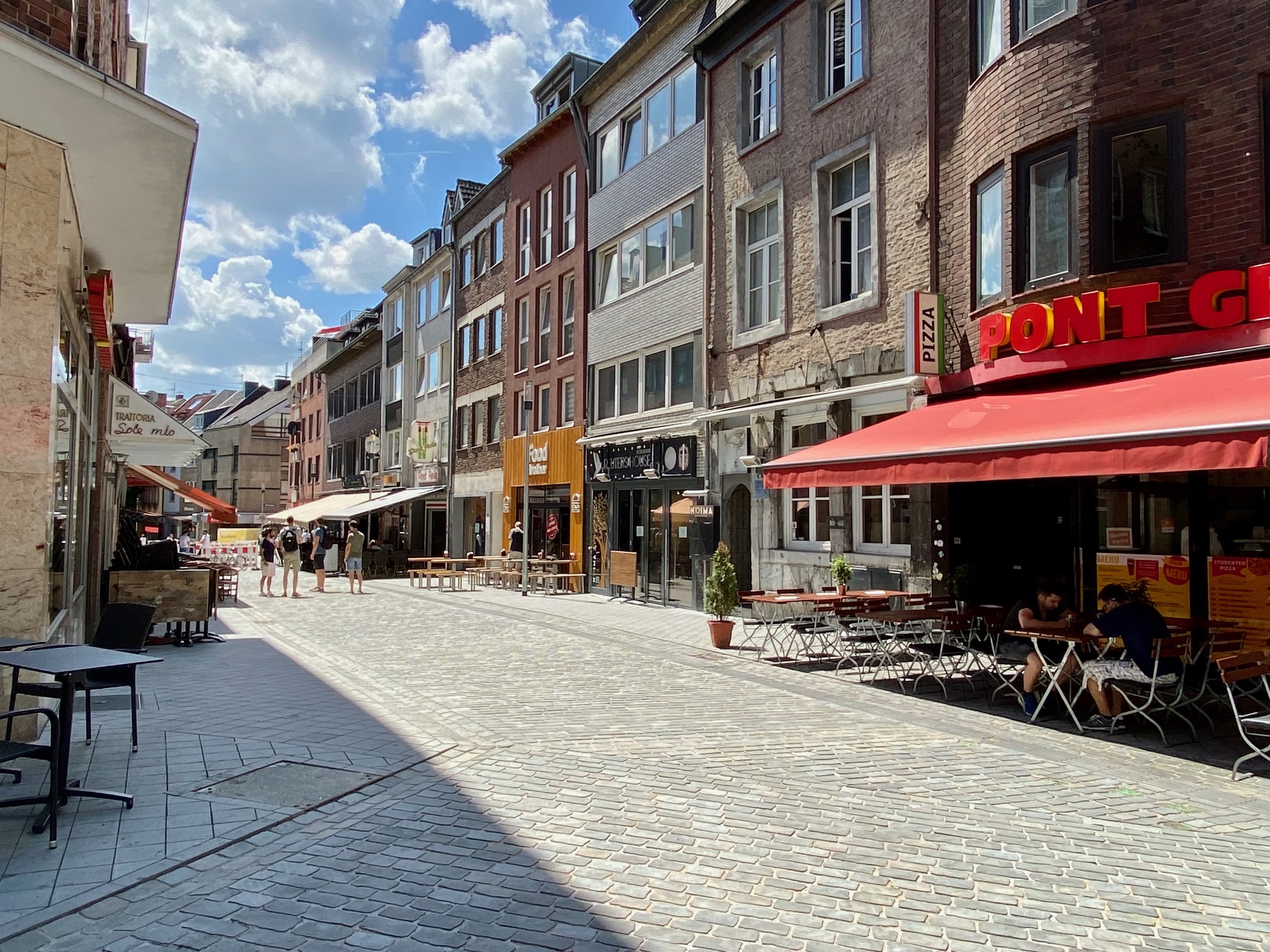 Zunächst in die Pontstraße. Unten – auf Höhe der Sparkasse – wird noch gearbeitet, aber im oberen Bereich ist schon alles perfekt. Viel versiegelte Fläche gibt es und weit und breit keinen Baum. Aber das hat wohl seine Richtigkeit, bei der hohen Frequentierung sind große Ladezonen ein Muss. Derzeit ist wegen der Semesterferien wenig los in der Pontstraße, doch das wird sich ab Oktober schlagartig ändern. Bezüglich Gastronomie gibt es dort vor fast jedem Haus eine Terrasse.