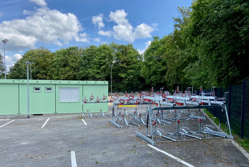 Via Twitter drauf aufmerksam geworden: Die neue Skaterbahn am Vennbahnweg wird fein. Der 1. Aachener Skateboard Club e.V. (1.ASC) erwartet offenbar jede Menge Radfahrer*innen auf seiner Anlage, denn Abstellplätze für Räder sind zu Hauf vorhanden. Dazu Pkw-Parkplätze und eine Art Unterkunft mit Behindertentoilette.