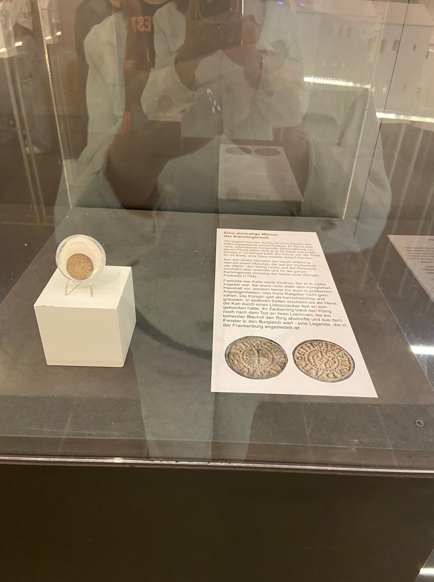 Im Centre Charlemagne am Katschhof ist ein neues, kleines Ausstellungsstück zu bewundern. Es ist eine Münze aus Kaiser Karls Zeiten, auf der die Gattin von Karl, Fastrada, erwähnt ist. Die Münze aus dem Jahr 793/94 ist aus Silber und gilt als Sensation. Das Silber ist mit der Zeit äußerst fragil geworden und daher auch in zwei Teile zerbrochen. Die wurden inzwischen dezent geklebt.